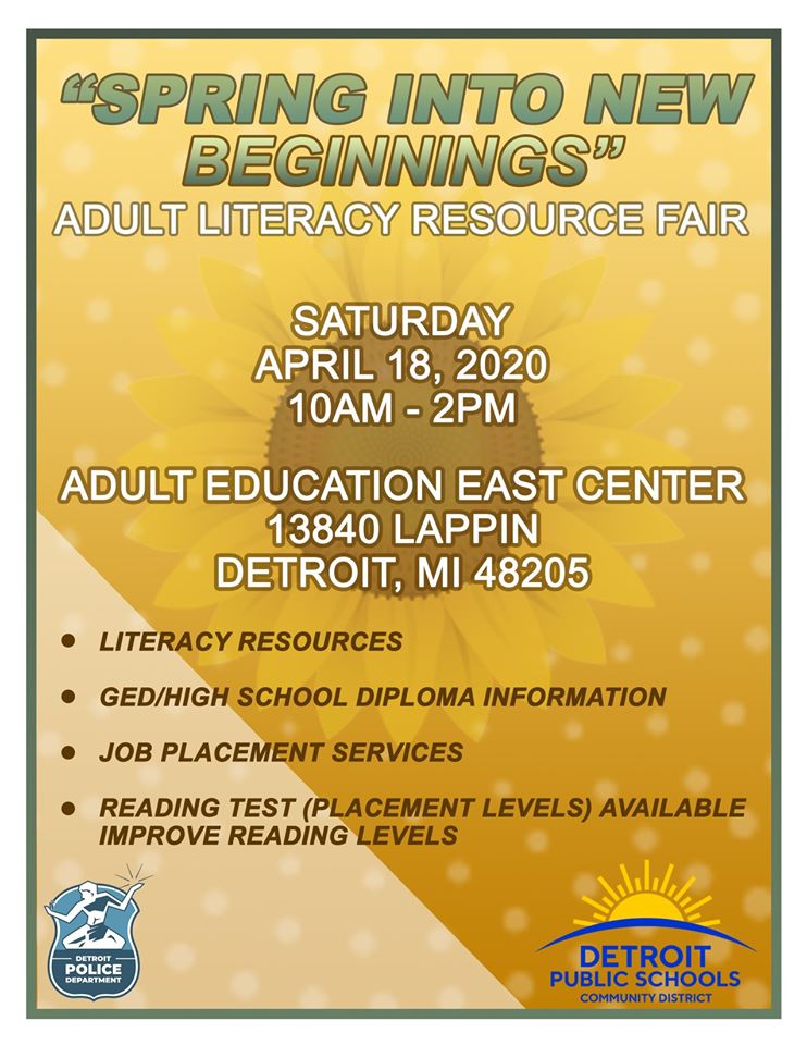 March 10, 2020 dpdpubinfo Detroit Police and DPS teaming up for Adult Literacy Fair Join the Detroit Police Department and Detroit Public Schools Community District to “Spring Into New Beginnings!” Share this: Click to share on X (Opens in new window) X Click to share on Facebook (Opens in new window) Facebook Like Loading... Related